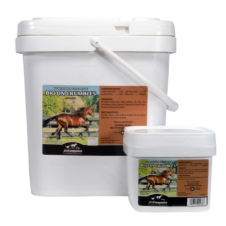 Top-dress ½ to 1 ounce of Biotin Crumbles into each horse’s daily ration.  1 ounce measure enclosed.
